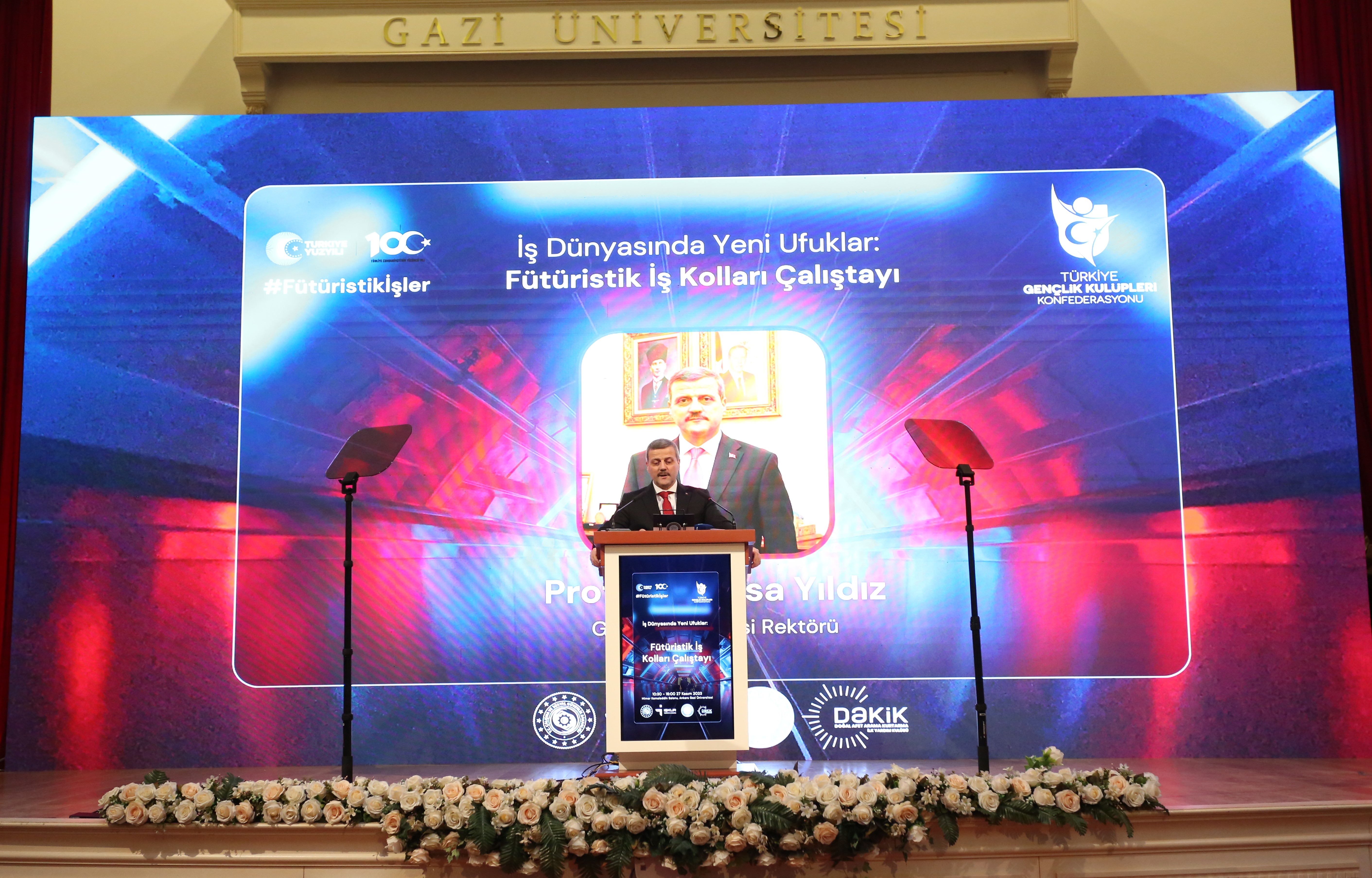Rektörümüz Prof. Dr. Musa Yıldız ise Gazi Üniversitesi olarak “Fütüristik İş Kolları Çalıştayı”na ev sahipliği yapıyor olmaktan ve desteklemekten dolayı memnuniyet duyduğunu ifade etti. Gazi Üniversitesi olarak eğitim anlayışını ve programları fütüristik bir perspektife taşımanın önemini her zaman vurguladıklarını söyleyen Prof. Dr. Musa Yıldız, “Bugün burada bir araya gelmiş olan bu seçkin topluluğun, geleceğin iş dünyasını şekillendirmek adına önemli bir misyona sahip olduğuna inanıyoruz. Eğitimde fütüristik bir bakış açısı benimsemek, öğrencilerimizin sadece günümüz ihtiyaçlarına değil, aynı zamanda yarının zorluklarına da hazır olmalarını sağlamaktır” dedi.